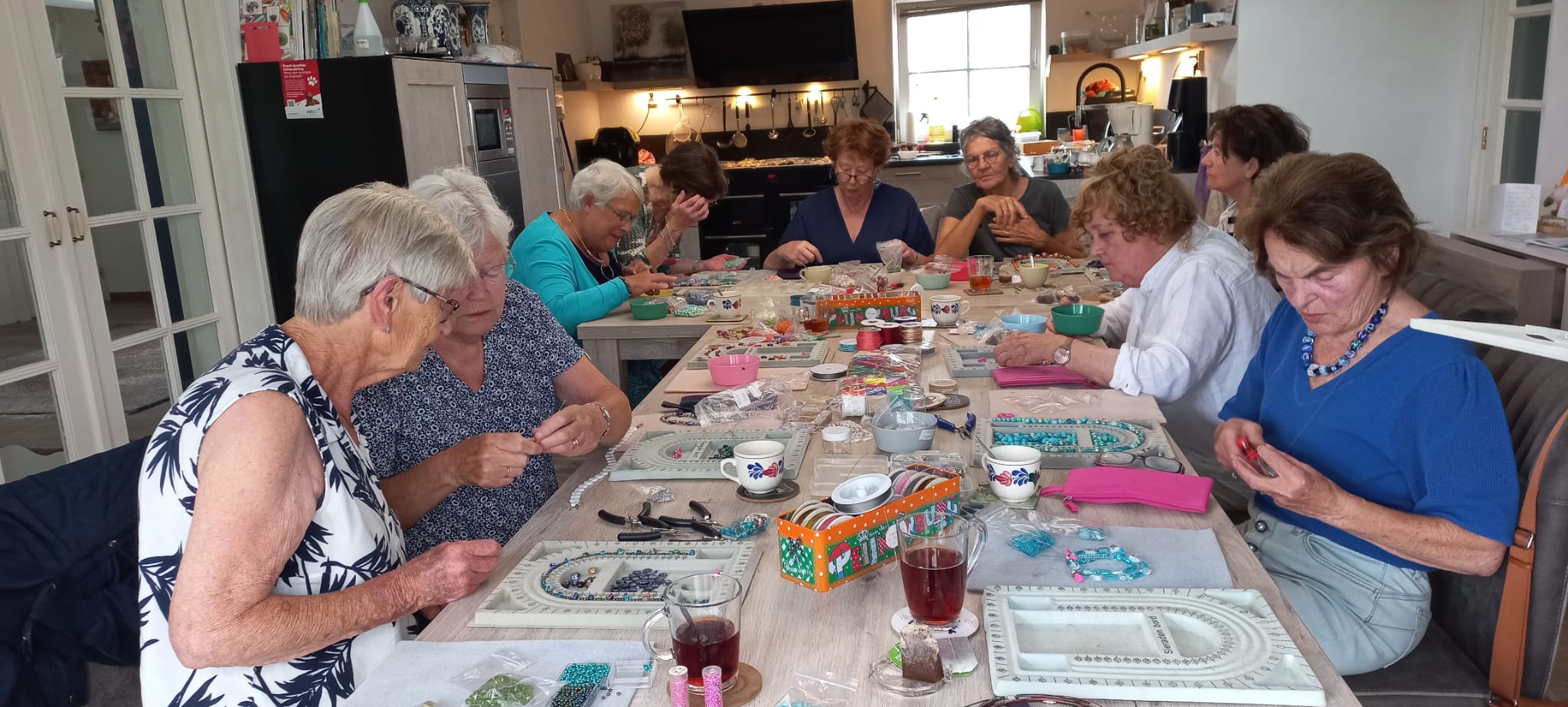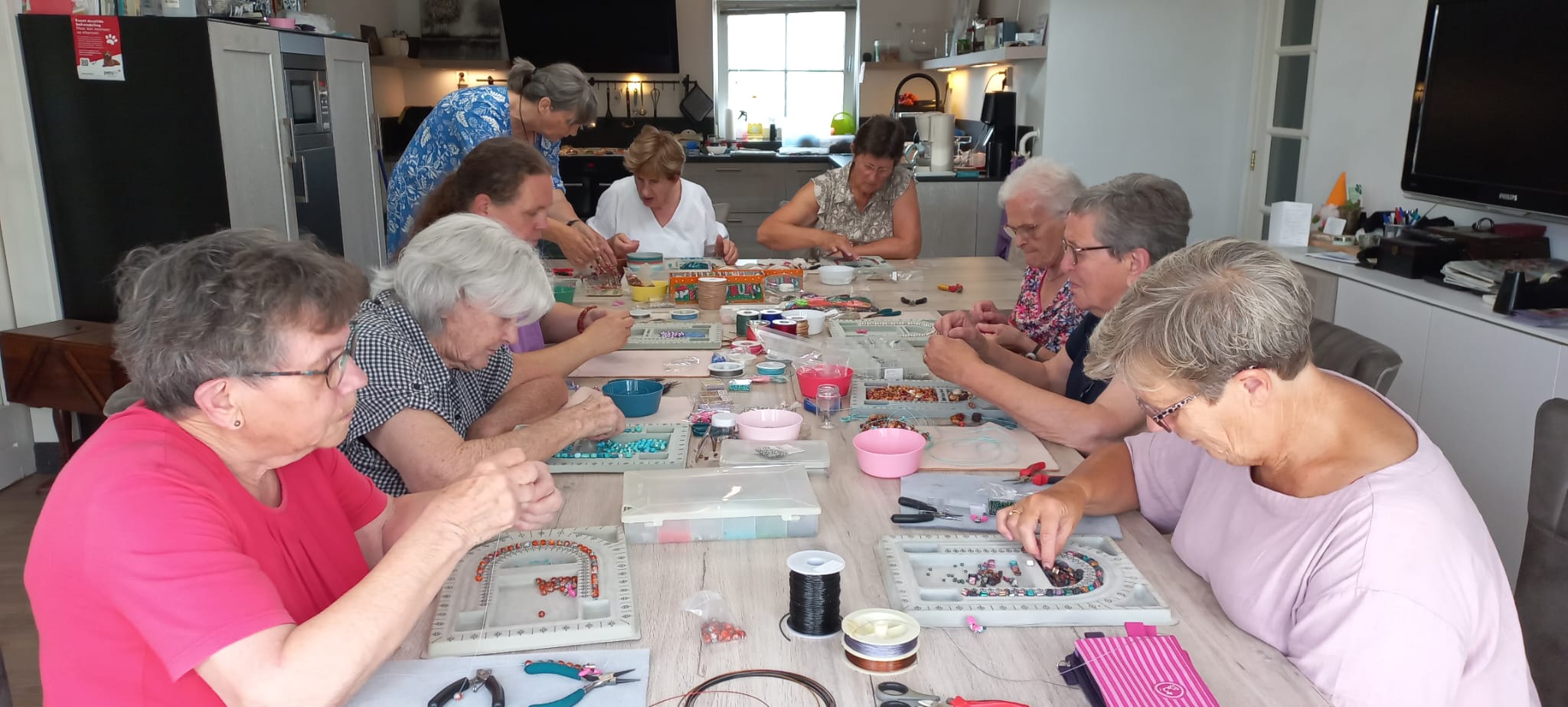 Er was veel voorwerk gedaan , voor 10 personen waren alle benodigdheden klaargelegd zodat we konden beginnen in een waar luilekkerland van kralen in allerlei soorten, kleuren en maten.