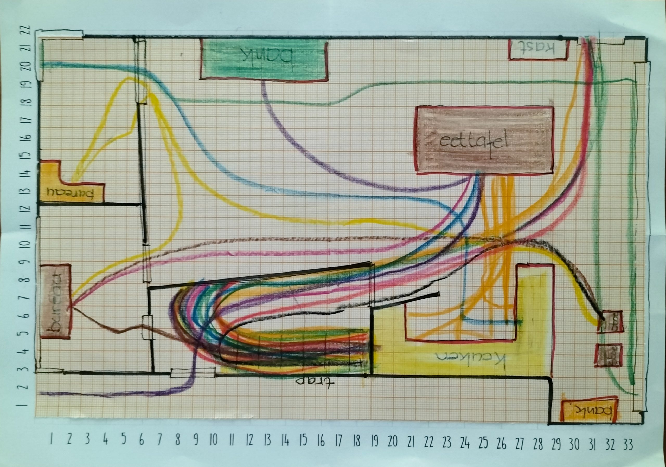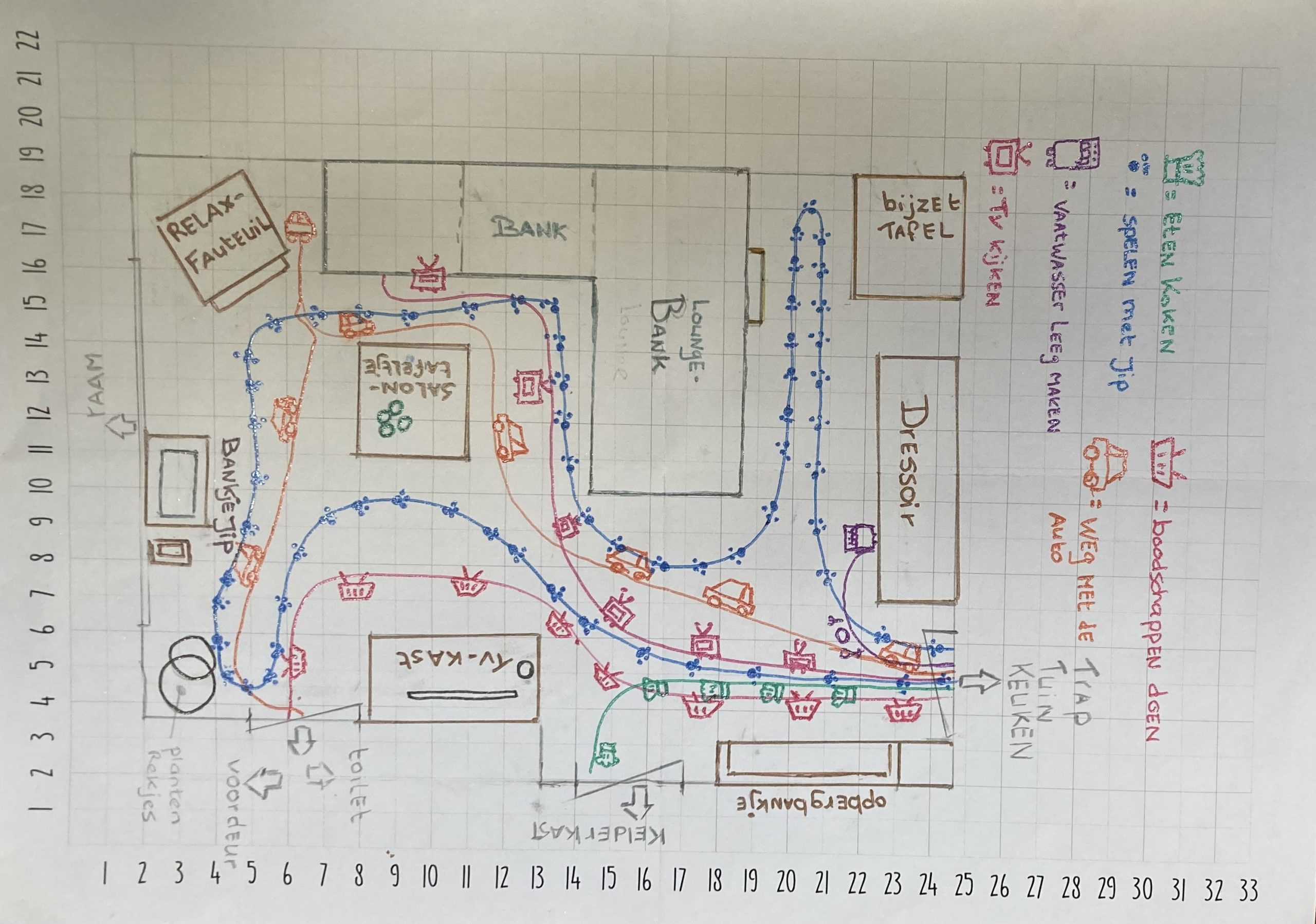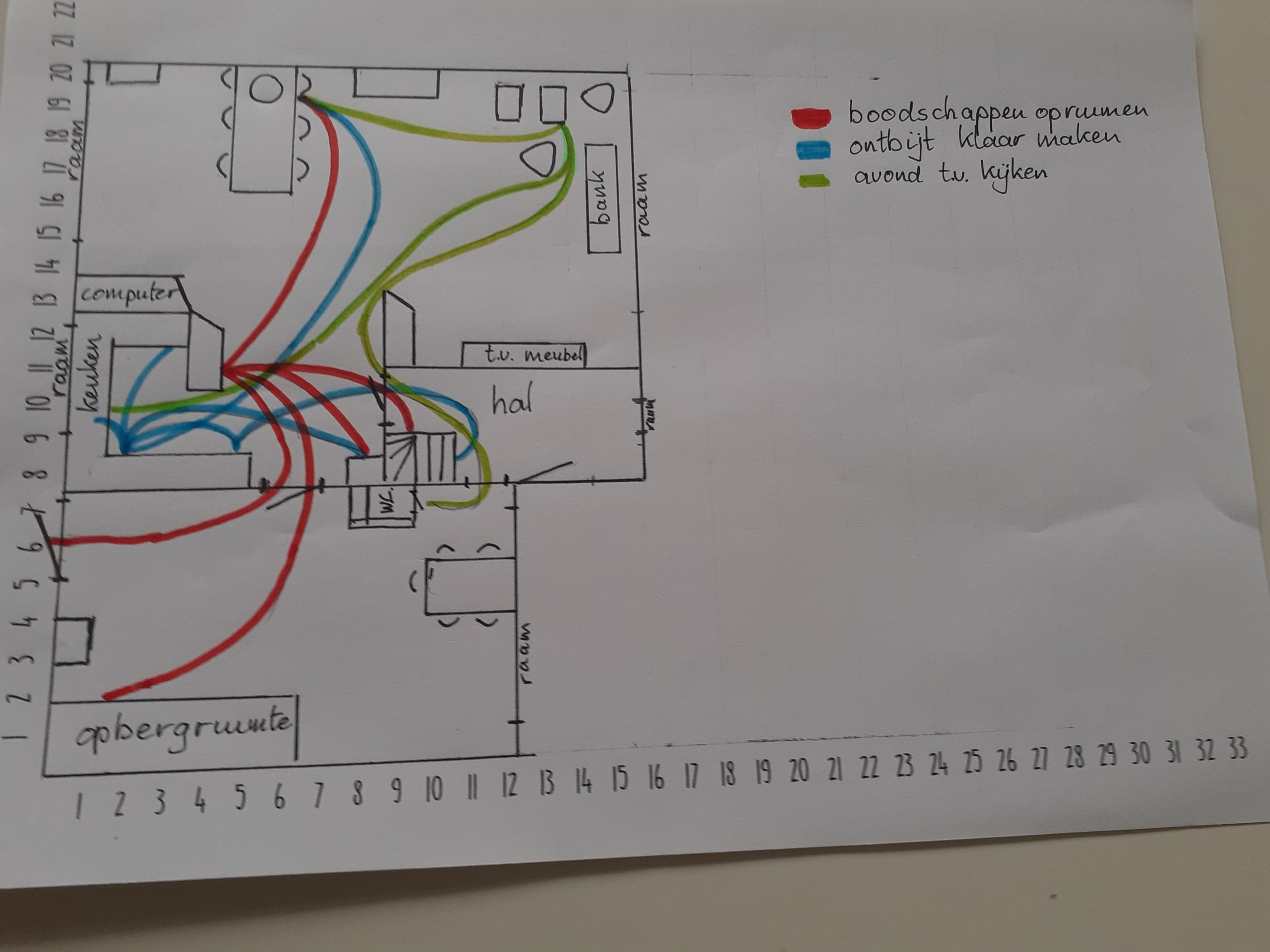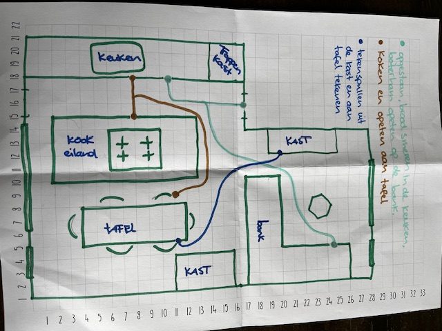 Teken de plattegrond van uw woonkamer en schets de routes die u loopt, b.v. gedurende een aantal uur of een dagdeel dat u regelmatig in beweging bent.