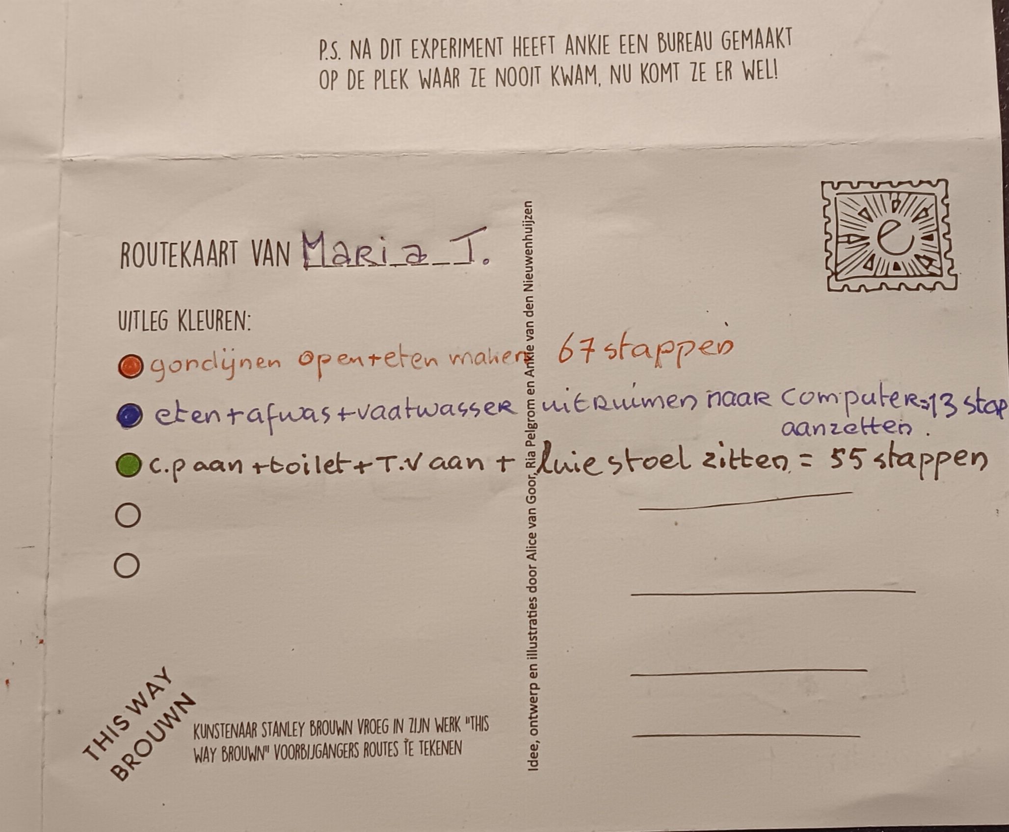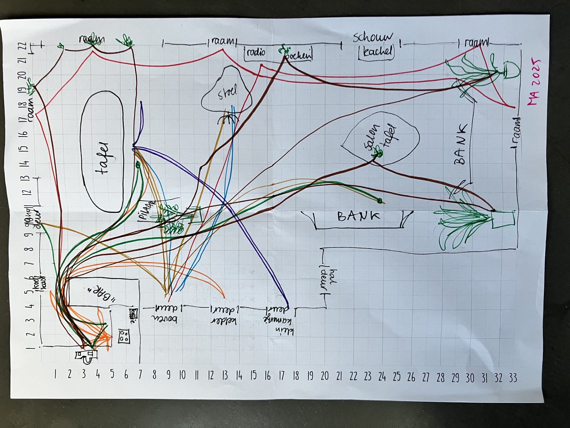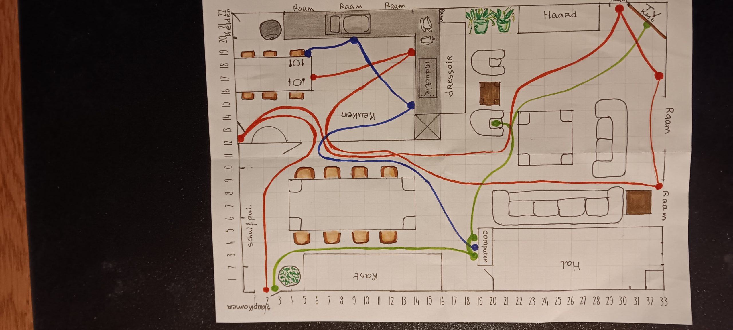 Teken de plattegrond van uw woonkamer en schets de routes die u loopt, b.v. gedurende een aantal uur of een dagdeel dat u regelmatig in beweging bent.
